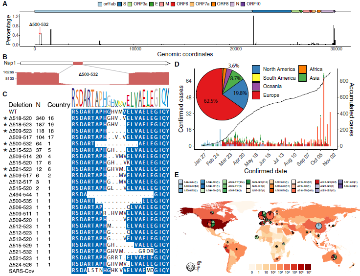 計算了SARS-CoV-2基因組中每個堿基對的缺失頻率,Δ500-532位點是第五大最常見的缺失區(qū)域(圖4A)。測序結果支持高序列深度的缺失,并通過Sanger測序驗證了缺失(圖4B)。從GISAID的37個國家的922例病例中,在Δ500-532位點找到了24種缺失變異(圖4C)。其中62.5%和19.8%分別來自歐洲和北美(圖4D),主要變種為Δ518-520 (Δ1aa), Δ518-523 (Δ2aa)和Δ509-523(Δ5aa)(圖4E)。因此,研究結果顯示SARS-CoV-2基因組中存在一個缺失熱點,相關病例數量在全球范圍內穩(wěn)步上升。