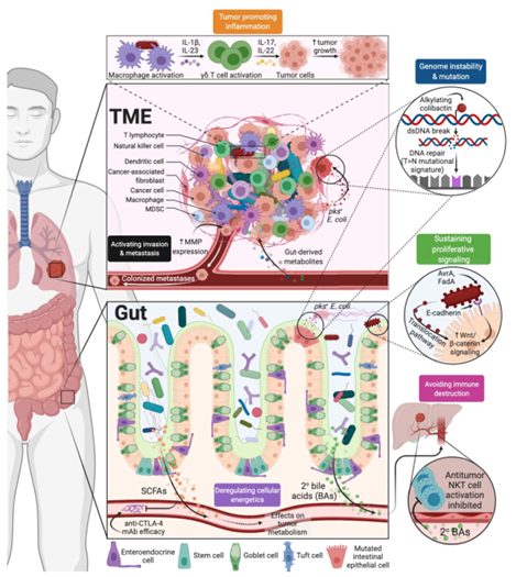 腸道中存在許多的微生物,它們是宿主能量獲取的關(guān)鍵中介,并且能將膳食營養(yǎng)素代謝為許多的生物活性物質(zhì),從而作為溝通腸道菌群與宿主相互作用的橋梁。腸道菌群由宿主基因、免疫應(yīng)答及飲食因素調(diào)控,而腸道菌群的代謝和免疫潛能決定了其在宿主健康和疾病中的重要意義。研究表明,腸道微生物紊亂與多種疾病的發(fā)生密切相關(guān),比如消化系統(tǒng)疾病、內(nèi)分泌系統(tǒng)疾病、精神系統(tǒng)疾病、自身免疫性疾病以及一些感染性疾病。基于這些影響,人們越來越關(guān)注通過微生物靶向治療癌癥和其他疾病。