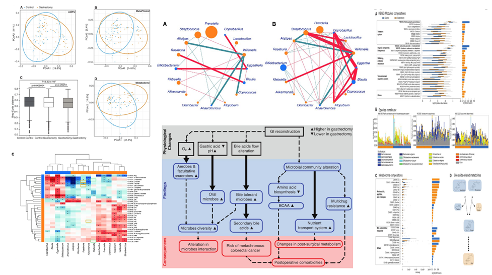 最近的證據(jù)表明,腸道微生物組參與了術(shù)后結(jié)果,包括胃切除術(shù)后。該研究對有胃癌切除史患者(n=50)和健康個體(n=56)的糞便樣本的宏基因組測序和代謝組學(xué)分析結(jié)果進(jìn)行對比分析。結(jié)果表明,胃切除術(shù)后不僅改變了患者糞便中微生物(如需氧菌和兼性厭氧菌等)群落構(gòu)變化,也改變了微生物功能特征,如營養(yǎng)物質(zhì)運(yùn)輸和有機(jī)化合物生物合成;胃切除術(shù)后患者體內(nèi)代謝物發(fā)生變化,如兩組間的基因毒性脫氧膽酸和支鏈氨基酸等膽汁酸含量存在差異,此外部分結(jié)直腸癌相關(guān)菌在胃切除術(shù)后患者中表現(xiàn)出相似模式,如具核梭桿菌在全胃切除術(shù)后患者中明顯富集。結(jié)果揭示了胃切除術(shù)后腸道微生物群的改變,提示其與術(shù)后并發(fā)癥相關(guān)。