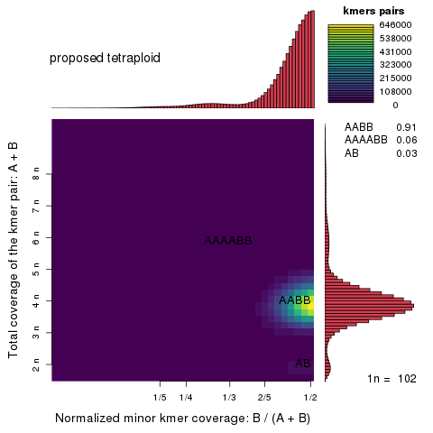 Smudgeplot通過(guò)尋找雜合k-mer來(lái)研究基因組的倍性,其定義的雜合k-mer對(duì)指的是一對(duì)k-mer之間只相差一個(gè)堿基,且沒有第三個(gè)k-mer與他們?cè)傧嗖钜粋€(gè)堿基(如ATGATCA, ATGCTCA, ATGGTCA)。對(duì)于一個(gè)AB形式的雜合,smudgeplot試圖從所有k-mer中尋找一對(duì)雜合k-mer,而對(duì)于一個(gè)AAB形式的雜合,smudgeplot試圖尋找兩條相同的k-mer和一條它們的雜合k-mer,在圖中表示為更高的亮度。如下圖對(duì)一個(gè)四倍體的smudgeplot分析,可以明顯的看出AABB雜合模式附近的k-mer數(shù)量明顯高于其它k-mer,左上角也描述了這個(gè)結(jié)果。