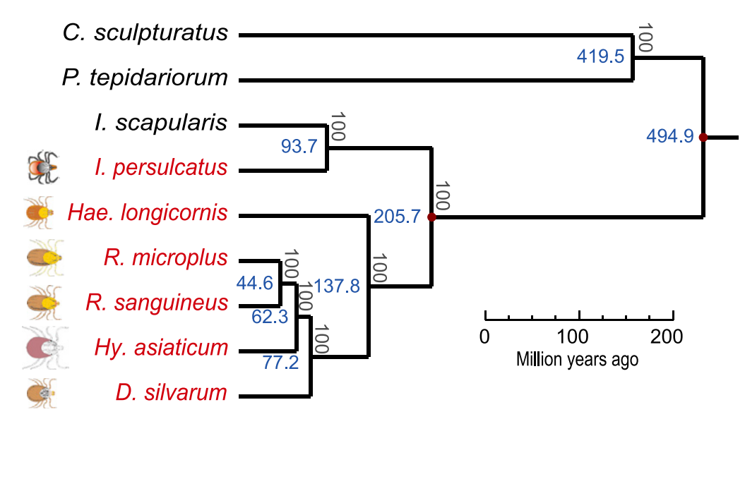 除了上述跨越科水平的譜系基因組研究,其實(shí)還有很多同科內(nèi)不同屬間的動(dòng)物群體基因組。例如通過(guò)構(gòu)建硬蜱科內(nèi)6種蜱蟲(chóng)基因組,解析不同蜱種的演化歷程,揭示了蜱專(zhuān)性吸血的遺傳機(jī)制以及蜱蟲(chóng)遺傳多樣性及分布規(guī)律,并通過(guò)宏基因組學(xué)研究等方式探究了蜱媒病原體的生態(tài)分布和進(jìn)化機(jī)制(Jia N et al., Cell.2020)。