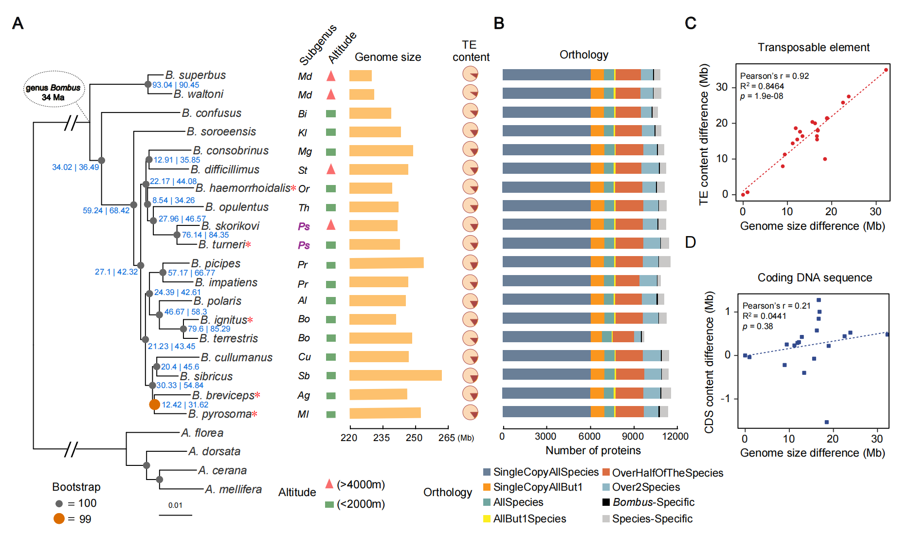 針對(duì)于同一個(gè)屬內(nèi)不同種之間的研究,由于其間親緣關(guān)系相對(duì)較近,基因組間相似度較高,往往是對(duì)其基因結(jié)構(gòu)特征差異、轉(zhuǎn)座子分析、屬內(nèi)分類(lèi)研究、基因組間的基因漸滲現(xiàn)象、大型結(jié)構(gòu)變異挖掘、基因正選擇分析上進(jìn)行。例如,作者通過(guò)構(gòu)建20個(gè)新的袖蝶屬基因組揭示基因滲入和不完全譜系分選的作用(Edelman N B et al.,Science.2020)、通過(guò)15個(gè)亞屬的17種熊蜂基因組確定了關(guān)鍵生態(tài)和取食偏好等行為特征相關(guān)的變異(Sun C et al.,Mol Biol Evol.2020)。