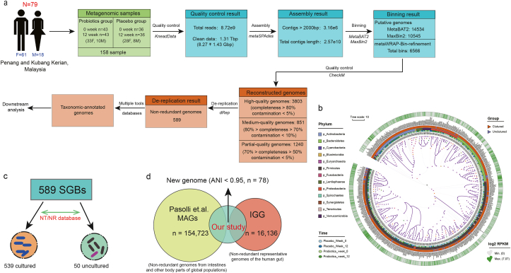 (a) 宏基因組組裝、分箱、構(gòu)建和去重復(fù)的流程中產(chǎn)生了總共 589 個(gè)高質(zhì)量SGB。(b) 589 個(gè)高質(zhì)量 SGB 的系統(tǒng)發(fā)育位置。樹的熱圖顯示了在實(shí)驗(yàn)期間 SGB 的每千堿基讀取數(shù) (RPKM) 的 log2 倍變化。(c) 在 589 個(gè) SGB 中,分別有 539 個(gè)和 50 個(gè)之前培養(yǎng)過和未培養(yǎng)過。(d) 78 個(gè)SGB的新穎性。通過與 IGG 數(shù)據(jù)庫(16,136 個(gè)非冗余代表性人類腸道基因組的集合)和 Pasolli ?et al.?MAGs 數(shù)據(jù)庫(來自全球人口腸道和其他身體部位的 154,723 個(gè)非冗余基因組的數(shù)據(jù)集)的交叉比較發(fā)現(xiàn)都不匹配?(<95% average nucleotide similarity)?。