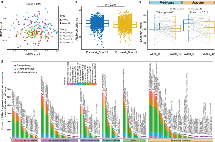 益生菌 (pro) 和安慰劑 (pla) 組在兩個(gè)時(shí)間點(diǎn)的預(yù)測(cè)腸道代謝組之間的差異。(a) 非度量多維標(biāo)度(NMDS,Bray-Curtis 相似性指數(shù))和(b)對(duì)在第 0 周和第 12 周對(duì)兩組受試者的預(yù)測(cè)微生物組和代謝組進(jìn)行了Procrustes 分析,表明顯示微生物組學(xué)和代謝組學(xué)特征之間的正協(xié)同性(correlation = 0.386;P??= 0.001)。(c) 益生菌組第 0 周和第 12 周之間預(yù)測(cè)的差異神經(jīng)活性代謝物。p 值經(jīng) FDR 法校正,閾值 P < 0.05 表示顯著。