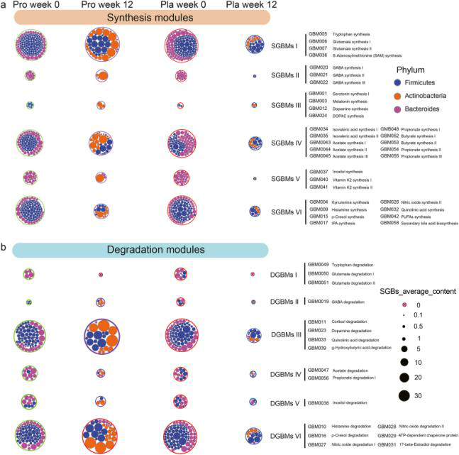 門級(jí)腸腦模塊 (GBM) 的分布。顯示了益生菌 (pro) 和安慰劑 (pla) 組中不同類型的 (a) 合成相關(guān)的GBM (SGBM) 和 (b) 降解相關(guān)的GBM (DGBM) 的分布及其在門水平上的組成。已鑒定的 SGBMs/DGBMs 根據(jù)其代謝物合成的預(yù)測(cè)功能分別分為六組(I 至 VI),并將它們相關(guān)的物種水平基因組箱(SGBs)分配給相應(yīng)的門。外圈的大小代表相應(yīng) SGB 的平均豐度。