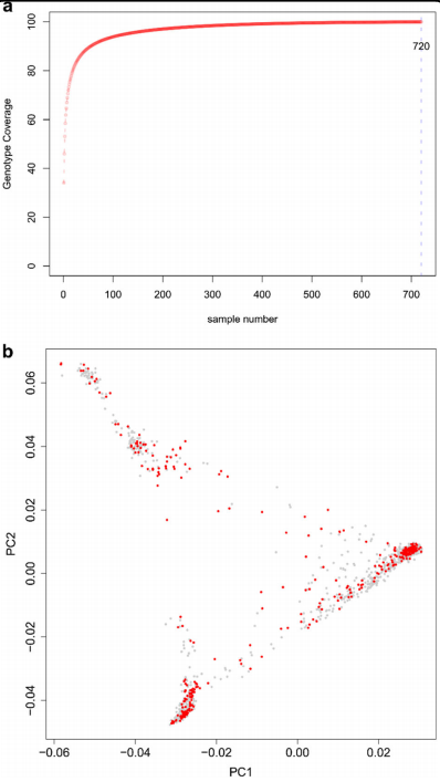 遺傳多樣性為植物育種和遺傳研究奠定了基礎(chǔ)。3K水稻基因組 (3KRG) 項(xiàng)目對3000多個(gè)水稻基因組進(jìn)行了測序。本研究新增了四個(gè)印度水稻品種以創(chuàng)建一個(gè)包含3004個(gè)水稻品種的群體。但是如此多的種質(zhì)資源難以保存和評估。構(gòu)建核心和微核心種質(zhì)是遺傳資源管理的有效方法。因此,本研究開發(fā)了一個(gè)包含 520 個(gè)種質(zhì)的微核心種質(zhì)集,它捕獲了大部分SNP并代表了原始種質(zhì)資源群體中的所有表型和地理區(qū)域。微核心種質(zhì)集使用不同的統(tǒng)計(jì)分析進(jìn)行了驗(yàn)證,并包含來自所有主要水稻的代表,包括粳稻、秈稻、aus/boro 和印度香米等。微核心種質(zhì)集的全基因組關(guān)聯(lián)分析有效地復(fù)現(xiàn)了原始群體中確定的標(biāo)記-性狀關(guān)聯(lián)。單倍型分析驗(yàn)證了微核心種質(zhì)集的實(shí)用性。本研究中開發(fā)的水稻微核心種質(zhì)集對于農(nóng)藝性狀評估和通過標(biāo)記輔助分子育種進(jìn)行的水稻改良具有重要價(jià)值。