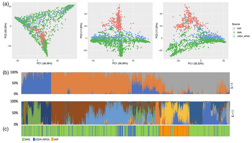 基因庫收集和保存大量植物和詳細(xì)的護(hù)照信息,目的是保護(hù)遺傳多樣性以進(jìn)行保護(hù)和育種。此類集合的遺傳表征有可能闡明重要作物的遺傳歷史,使用標(biāo)記-性狀關(guān)聯(lián)來鑒定感興趣性狀的位點(diǎn),尋找正在進(jìn)行選擇的位點(diǎn),并通過識別分類錯(cuò)配和重復(fù)為基因庫管理作出貢獻(xiàn)。本研究通過GBS測序?qū)碜匀蚧驇斓?0,038個(gè)辣椒 (Capsicum spp.) 種質(zhì)進(jìn)行基因分型,并調(diào)查了這種標(biāo)志性主食的近期歷史?;赟NP數(shù)據(jù)計(jì)算了identity-by-state (IBS) 比例,在基因庫內(nèi)和基因庫之間檢測到多達(dá) 1,618 個(gè)重復(fù)種質(zhì)。進(jìn)一步深入分析了常見食用辣椒的遺傳多樣性以調(diào)查其歷史,發(fā)現(xiàn)在全球廣泛地區(qū)收集的辣椒種類有很大的重疊。GWAS分析和選擇清除分析發(fā)現(xiàn)辣椒性狀,如刺激性,這些性狀在全球分布不均勻,表明人類偏好對馴化辣椒的遺傳結(jié)構(gòu)產(chǎn)生了主要影響。