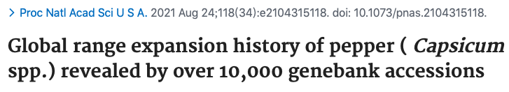 [2] Tripodi P, Rabanus-Wallace MT, Barchi L, et al. Global range expansion history of pepper (Capsicum spp.) revealed by over 10,000 genebank accessions. Proc Natl Acad Sci U S A. 2021;118(34):e2104315118.