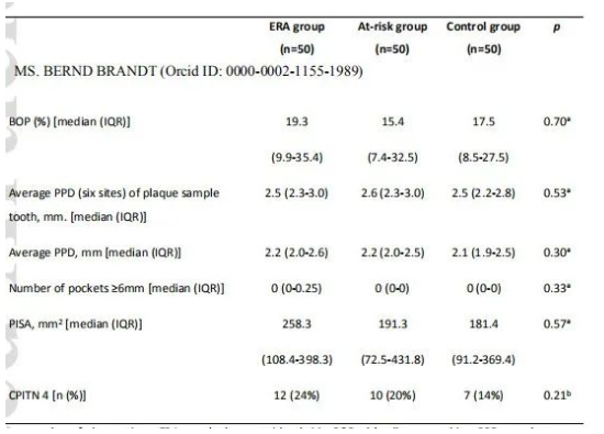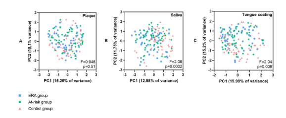 方法:招募三組(每組50人):ERA患者、高危個體和健康對照。牙周檢測結果為探診出血評分(BOP)、袋探診深度評分(PPD)和牙周炎癥表面積評分(PISA)。采用16S rDNA擴增子測序評估齦下牙菌斑、唾液和舌苔的微生物組成,并采用PERMANOVA進行組間差異分析。