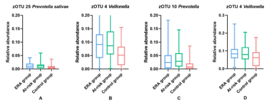 25個zOTUs在組間存在差異,7個zOUTs在至少一組中相對豐度≥0.01。Post-hoc Mann-Whitney U檢驗顯示,顯著性差異結果主要由于ERA組和高危組與對照組的差異造成的,而不是ERA組和高危組之間的差異。相比于對照組Prevotella salivae(zOTU25)、Veillonella(zOTU4)和Prevotella(zOTU10)在ERA組和高危組更加豐富(圖2A-C),相比于其他兩組Neisseria flavescens / subflava(zOTU7)、Porphyromonas pasteri /sp._oral_taxon_278(zOTU15)和Veillonella parvula(zOTU12)在對照組更豐富。與ERA組相比僅有Fusobacterium periodonticum(zOTU 13)在高危組和對照組更豐富,而兩組之間差異不顯著。