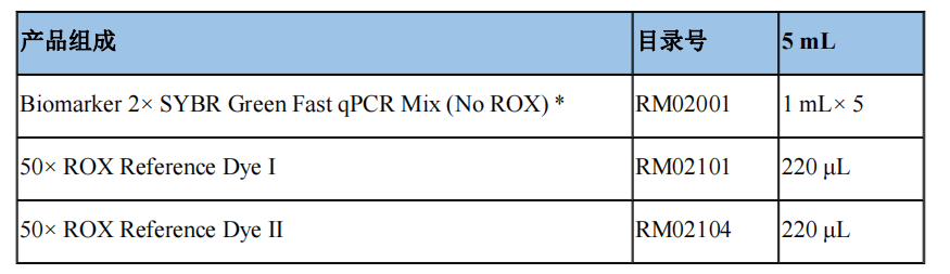 Biomarker 2× SYBR Green Fast qPCR Mix采用SYBR? Green I 嵌合熒光法進(jìn)行qPCR反應(yīng),通過對SYBR? / FAM通道進(jìn)行熒光信號定量檢測,可以獲得PCR過程中DNA擴(kuò)增的真實(shí)數(shù)據(jù)。Taq DNA酶采用抗體法熱啟動進(jìn)行擴(kuò)增,可以有效抑制引物退火導(dǎo)致的非特異性擴(kuò)增,極大地提高產(chǎn)品的特異性。且試劑盒中含有特殊的ROX Reference Dye,適用于所有qPCR儀器。
