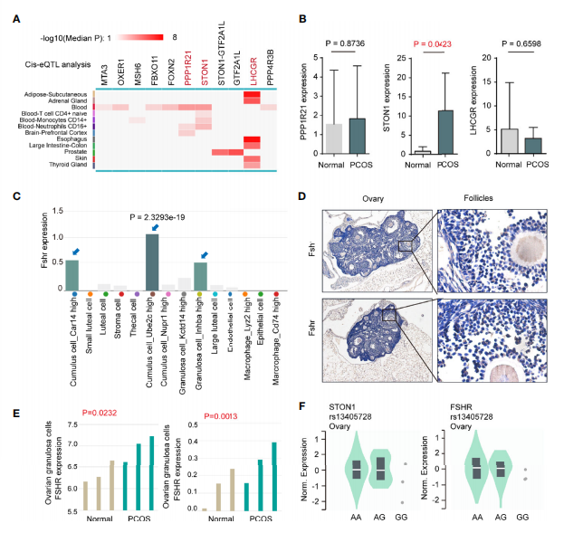 對(duì)卵巢組織的單細(xì)胞測(cè)序數(shù)據(jù)進(jìn)行映射,發(fā)現(xiàn) FSHR 在 Cumulus cell_Ube2c 簇(P = 2.3293e-19)、Granulosa cell_Inhba 簇和 Cumulus cell_Car14 簇中高度表達(dá)(圖 2C)。這種表達(dá)模式在小鼠卵巢組織中得到驗(yàn)證(圖 2D)。在患者的卵巢顆粒細(xì)胞中,發(fā)現(xiàn) PCOS 患者的 FSHR 表達(dá)高于正?;颊撸珿SE114419(P = 0.0232)和 GSE138518(P = 0.0013)數(shù)據(jù)集(圖 2E)。此外,我們對(duì)卵巢組織中的 STON1、FSHR 和 rs13405728 SNP 進(jìn)行了單組織 eQTL 分析(圖 2F)。