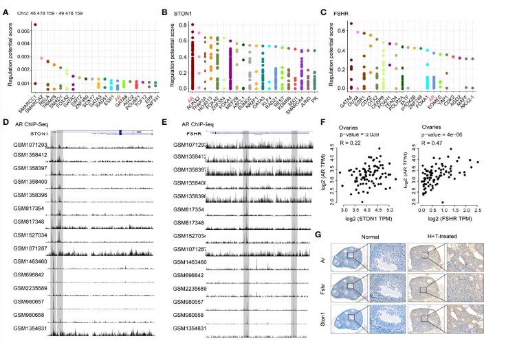 圖5. AR 被鑒定為 STON1 和 FSHR 的共同轉(zhuǎn)錄因子,并且與卵巢組織中 STON1 和 FSHR 的表達(dá)呈正相關(guān)