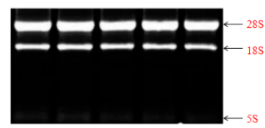 真核生物RNA特有28S、18S、5S三條帶,進(jìn)行瓊脂糖凝膠電泳分析時(shí),28S條帶的亮度大概是18S條帶的兩倍或者以上,且無拖尾,說明RNA的完整性高、未被其他雜質(zhì)污染。若出現(xiàn)其他條帶、或者條帶彌散拖尾,建議重新提取RNA。