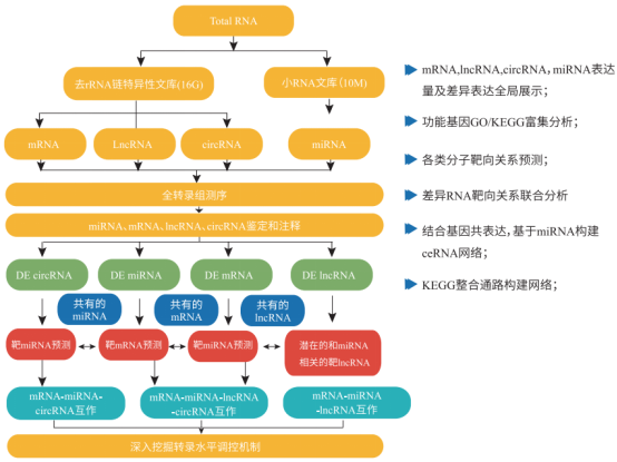 百邁客全轉(zhuǎn)錄組測序服務是一次檢測,獲得四種分子(mRNA、lncRNA、circRNA、miRNA)信息,針對不同類型的RNA進行表達分析,結(jié)構(gòu)研究以及全新轉(zhuǎn)錄本的發(fā)現(xiàn),并結(jié)合競爭性內(nèi)源RNA(ceRNA)機制,進行聯(lián)合分析,深入挖掘轉(zhuǎn)錄水平調(diào)控網(wǎng)絡,深度探究各類RNA分子的調(diào)控機制。分析內(nèi)容如下: