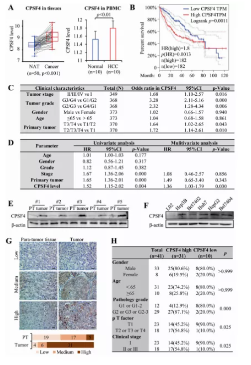 由于CPSF4表達在HCC中顯著增加,并且其高水平表達對應于HCC中OS的最高風險,因此本研究將重點放在CPSF4上。通過比較50對配對的序列數(shù)據(jù),發(fā)現(xiàn)HCC腫瘤組織中CPSF4表達水平顯著高于正常鄰近組織。來自GSE49515的微陣列數(shù)據(jù)還表明,10名HCC患者的外周血單核細胞(PBMC)樣本中的CPSF4水平顯著高于10名健康對照,這表明CPSF4可以作為HCC診斷的生物標志物(圖 1A)。Kaplan-Meier對364例患者的生存分析顯示,5 年生存率從 CPSF4低表達患者的57%±5%下降到CPSF4高表達患者的42%±5%(p < 0.01,圖 1B)。進一步的相關(guān)分析表明,CPSF4與臨床TNM分期、病理分級和臨床分期顯著相關(guān)(圖 1C)。單變量分析表明HCC患者的OS率與高CPSF4表達之間存在關(guān)聯(lián)(p < 0.01)。多變量Cox回歸分析顯示CPSF4水平(p = 0.03)是OS的獨立預后因素(圖 1D)。