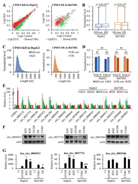 為了驗證,本研究首先從GEO數(shù)據(jù)庫中選擇了HCC組織中807個下調(diào)的circRNA(FC>2,p<0.05);然后從RNA-seq數(shù)據(jù)中篩選了1447個在CPSF4-OE細胞中下調(diào)或在CPSF4-KD細胞中上調(diào)的circRNA。這兩組數(shù)據(jù)取交集,共得到24個circRNA作為驗證的候選circRNA;結(jié)構(gòu)分析表明其中16個含有PAS序列。實時PCR結(jié)果顯示,這16個circRNA中有13個在CPSF4-OE細胞中被抑制,但在CPSF4-KD細胞中被激活(圖 2E)。選擇2個帶有PAS元件的circRNA,hsa_circ_0027774 和 hsa_circ_0004913 作為CPSF4靶向的circRNA;同時,另一個廣泛研究的不含PAS元件的circRNA hsa_circ_0001946作為CPSF4非靶向circRNA。Northern blot結(jié)果表明hsa_circ_0027774和hsa_circ_0004913與CPSF4呈負相關(guān),但hsa_circ_0001946在所有細胞系中保持相同水平(圖 2F)。同時構(gòu)建了這三種circRNA的OE質(zhì)粒并與CPSF4 OE或KD質(zhì)粒共轉(zhuǎn)染,real-time PCR結(jié)果顯示帶有PAS的circRNA(hsa_circ_0027774和hsa_circ_0004913)與CPSF4水平呈負相關(guān),而不含PAS的circRNA(hsa_circ_0027774和hsa_circ_0004913)不受CPSF4的影響(圖 2G),這說明CPSF4在轉(zhuǎn)錄后抑制了circRNA??傊?,CPSF4直接調(diào)節(jié)HCC細胞中帶有PAS元件的circRNA的表達。