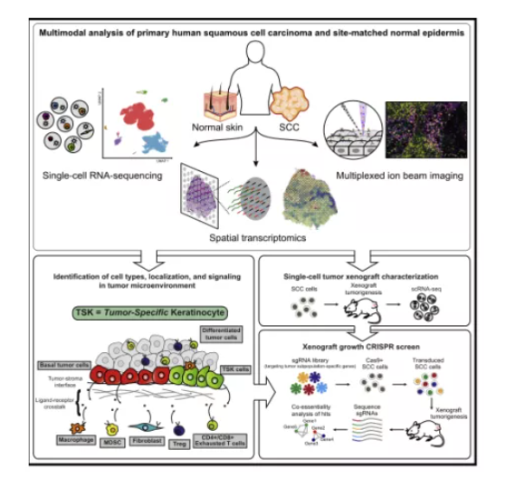 為了確定皮膚鱗狀細胞癌(cSCC)的細胞組成和結(jié)構,該研究團隊對10對配對的人體鱗狀細胞癌組織和正常組織單細胞RNA測序、空間轉(zhuǎn)錄組和多路離子束成像。識別到四個細胞亞群,三個正常細胞亞群以及一個定位于纖維血管邊緣的腫瘤特異性角化細胞(TSK)群??臻g轉(zhuǎn)錄分析揭示了TSK細胞作為細胞間通信的樞紐。最后,人類腫瘤異種移植物的單細胞特性和體內(nèi)CRISPR篩選確定了特異性腫瘤富集基因亞群和相互作用網(wǎng)絡在腫瘤發(fā)生中的重要作用。
