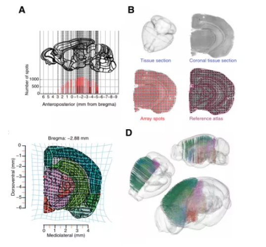 通過使用全腦空間轉(zhuǎn)錄組學基于對空間定義特征的無偏識別來生成成年小鼠大腦的系統(tǒng)分類。研究發(fā)現(xiàn)分子信息足以推斷大腦的復雜而詳細的神經(jīng)解剖組織結(jié)構。無監(jiān)督分類顯示了特定于區(qū)域和層的子區(qū)域,在等皮層和海馬體以及紋狀體的新亞區(qū)。分子圖譜進一步支持了從單細胞RNA圖譜中表征神經(jīng)元的空間特性,并提供了使用最小基因集(大腦調(diào)色板)為大腦添加注釋的資源??傊?,本研究建立了一個分子圖譜來正式定義大腦區(qū)域的空間組織,包括用于映射和靶向離散神經(jīng)解剖結(jié)構域的分子代碼,通過空間維度直觀詮釋了大腦組織不同空間區(qū)域特征,為剖析大腦組織提供了全面的時空圖譜。