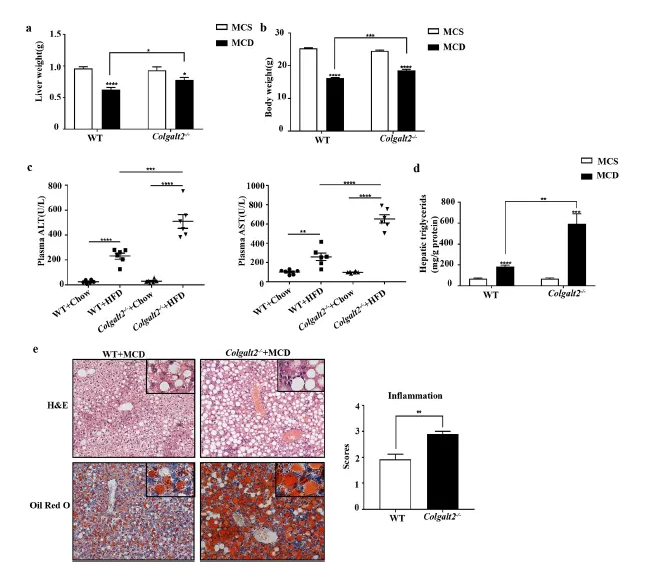 NASH是NAFLD疾病進(jìn)展階段。為了研究 Colgalt2對MCD誘導(dǎo)的脂肪性肝炎的影響,WT和Colgalt2?/?小鼠連續(xù)喂食MCD飲食3周。與WT小鼠相比,Colgalt2?/?小鼠的體重和肝臟重量增加(圖3a和b)。在MCD喂養(yǎng)的小鼠中,Colgalt2?/?小鼠的ALT和AST血漿水平及AST均顯著升高(圖3 c)。H&E和油紅O染色顯示,MCD喂養(yǎng)的Colgalt2?/?小鼠的肝臟脂肪變性和炎癥浸潤比WT小鼠更嚴(yán)重(圖3e)。與此同時,與WT小鼠相比,MCD喂養(yǎng)的Colgalt2?/?小鼠肝臟TG含量顯著增加(圖3d)。在MCD飲食組中,Colgalt2?/?小鼠的炎癥評分明顯高于WT小鼠(圖3e)。