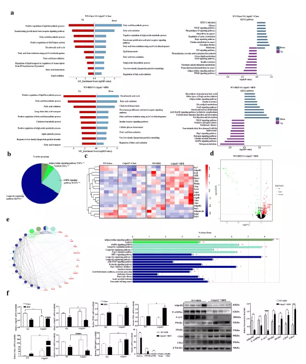 為了探索NAFLD中Colgalt2缺乏的潛在機制,作者對WT小鼠和飼喂HFD或標(biāo)準(zhǔn)飼料的Colgalt2?/?小鼠肝組織進(jìn)行ONT全長轉(zhuǎn)錄組測序。結(jié)果顯示,與WT小鼠相比,HFD喂養(yǎng)的Colgalt2?/?小鼠中有321個DEGs。為了明確DEGs的功能,分別對上調(diào)和下調(diào)的 DEGs進(jìn)行KEGG通路富集分析(P < 0.05) (圖5a)。對于上調(diào)的基因,KEGG分析顯示這些差異表達(dá)基因顯著富集于MAPK信號通路、NAFLD、和氧化磷酸化。下調(diào)的基因富集于脂肪消化和吸收、甘油脂代謝。在這些途徑中,19個差異表達(dá)基因與脂代謝密切相關(guān),包括adipoR1、adipoR2和脂質(zhì)合成相關(guān)的分子,包括Cidea和Cidec (FSP27)、Cd36和PPARγ(圖5c)。為了進(jìn)一步研究這19個基因在這些通路中的作用,使用ClueGO和CluePedia工具解讀這些通路網(wǎng)絡(luò)(圖5 d)。這些基因在AMPK信號通路、脂肪細(xì)胞因子信號通路和NAFLD等中富集(圖5 b和e)。