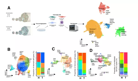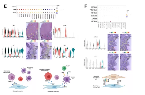 肌腱病,包括以疼痛和功能受限為特征的多因素肌腱疾病仍然是肌肉骨骼醫(yī)學(xué)的重大疑難問題。最近的研究結(jié)果強調(diào)了免疫介導(dǎo)機制在肌腱疾病中的關(guān)鍵作用,印證了通常與炎癥性風(fēng)濕病和肌肉骨骼疾病 (RMD) 相關(guān)的關(guān)鍵的免疫學(xué)和生物力學(xué)因素,在肌腱中也會表現(xiàn)出來。單細(xì)胞技術(shù)(scRNAseq) 越來越多地應(yīng)用于風(fēng)濕病學(xué),以識別驅(qū)動疾病發(fā)病機制的關(guān)鍵細(xì)胞表型。盡管在小細(xì)胞數(shù)量和異質(zhì)肌腱活檢方面做出了努力,仍然沒有詳細(xì)的空間肌腱細(xì)胞圖譜預(yù)知轉(zhuǎn)化目標(biāo)。因此本文利用scRNAseq和空間轉(zhuǎn)錄組(ST)強強聯(lián)合,進行細(xì)胞間相互作用分析以構(gòu)建動態(tài)細(xì)胞微環(huán)境的圖譜,驅(qū)動人類慢性肌腱疾病的發(fā)展。