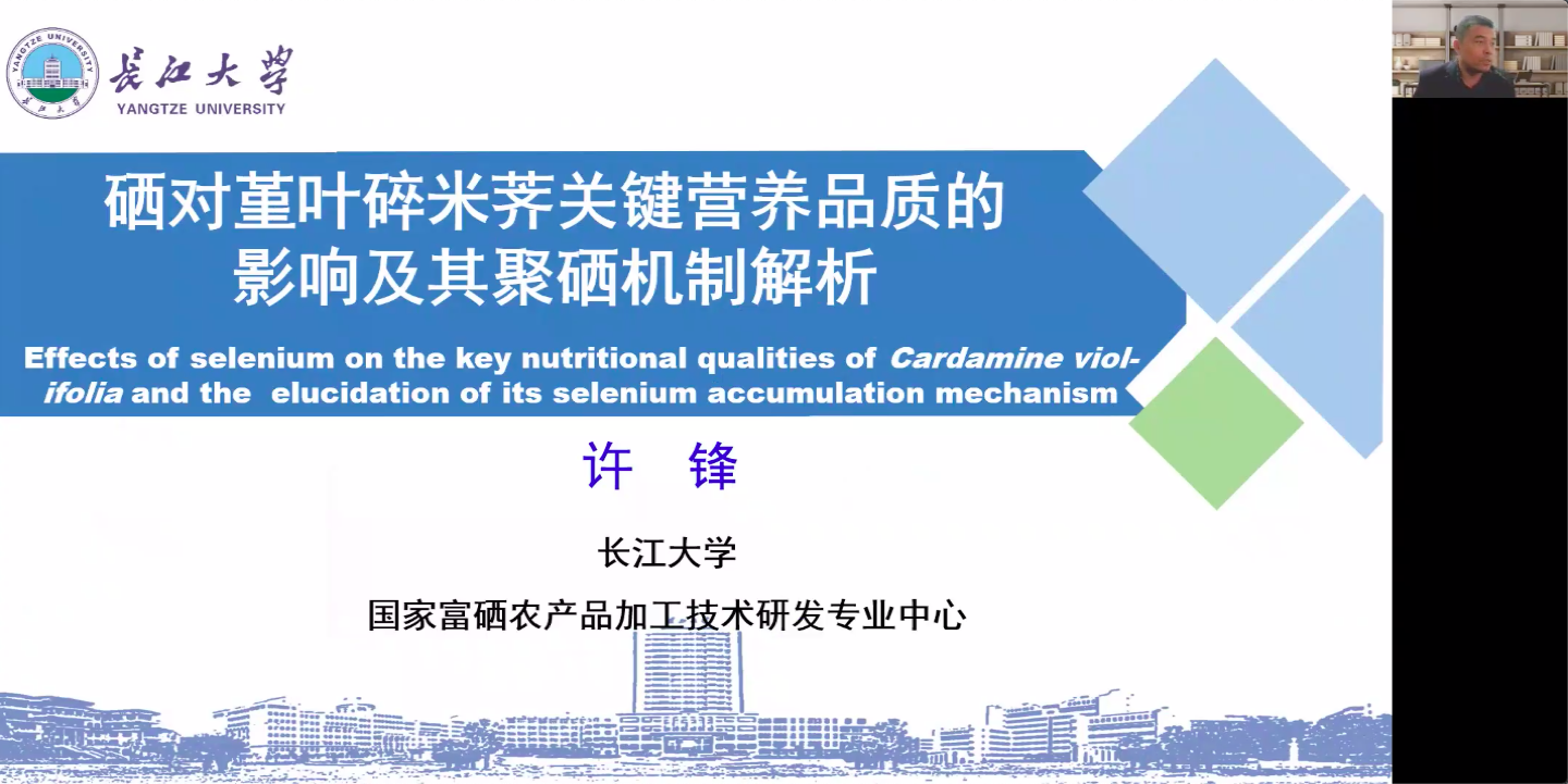 長江大學(xué)許鋒教授首先報告了外源硒處理下,堇葉碎米薺在幼苗期和成熟期都積累高含量的硒;然后講解了不同濃度的硒處理下,通過轉(zhuǎn)錄組、蛋白組和代謝組解析堇葉碎米薺的分子機制的研究工作,認為相關(guān)基因的表達變化減少了硫元素消耗,優(yōu)化了硫元素利用,可能是堇葉碎米薺耐硒的重要原因。