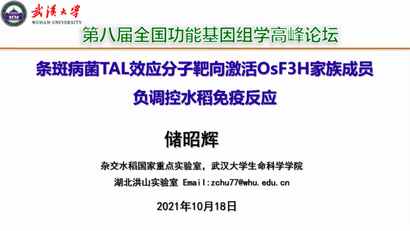 武漢大學(xué)生命科學(xué)學(xué)院儲昭輝教授報告了其團隊在水稻和條斑病菌互作上的研究進展,講解了HGA4菌株致病力更強的原因是其比RS105菌株包含更多TAL效應(yīng)因子,并且表明Tal2b、Tal2c是兩個致病因子,它們通過分別靶向調(diào)控水稻中OsF3H03g、OsF3H04g基因進而調(diào)控水稻對條斑病的抗性,最后展示了對其進行的一系列功能驗證與分子機制研究。