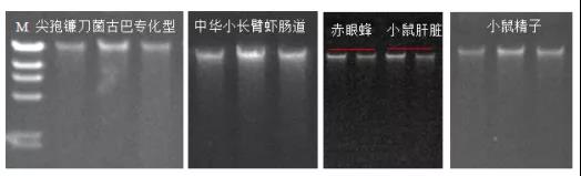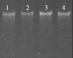 圖1:DNA的凝膠電泳圖。將提取的DNA進(jìn)行1.2%瓊脂糖凝膠電泳跑膠。Lane1:牛血;Lane 2:羊血;Lane 3:松毛蟲赤眼蜂;Lane 4:Hela細(xì)胞。