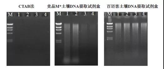 結(jié)論:CTAB法不適合土壤DNA提取;競品M*提取的DNA中有RNA的污染,DNA純度不高;百邁客土壤DNA提取試劑盒提取的DNA純度高,可用于后續(xù)的PCR實驗。