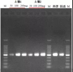 圖5:用百邁客土壤DNA提取試劑盒分別提取不同重量的土壤1(50/100/200 mg)、土壤2(50/100/200 mg)、糞便(100 mg)、扇貝腸道(100 mg)樣本里的DNA。將提取的DNA為模板,VR3為引物,進(jìn)行PCR擴(kuò)增。然后上樣跑膠,瓊脂糖濃度為1%,70 V電壓,跑膠45 min。