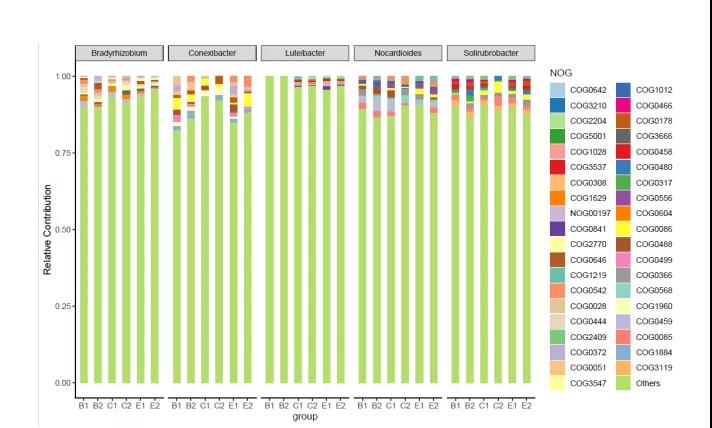根據(jù)樣本的物種、功能的對應(yīng)關(guān)系,進(jìn)行物種與功能相對豐度的關(guān)聯(lián)分析,可以得到特定物種的功能貢獻(xiàn)度、特定功能的物種貢獻(xiàn)度。該分析既可以指定kegg、eggNOG、GO、Pfam、CAZy、CARD、VFDB、PHI-base、P450數(shù)據(jù)庫的TOP/高豐度功能或代謝途徑主要存在于哪些物種,也可以分析TOP/高豐度物種的主要功能或代謝途徑。