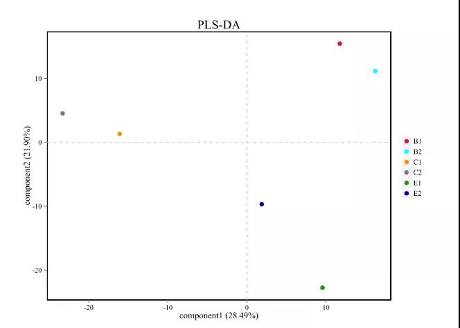 偏最小二乘判別分析(Partialleast squares discriminant analysis,PLS-DA)是多變量數(shù)據(jù)分析技術(shù)中的判別分析法,經(jīng)常用來處理分類和判別問題。通過對主成分適當(dāng)?shù)男D(zhuǎn),PLS-DA可以有效的對組間觀察值進(jìn)行區(qū)分,并且能夠找到導(dǎo)致組間區(qū)別的影響變量。PLS-DA采用了經(jīng)典的偏最小二乘回歸模型,其響應(yīng)變量是一組反應(yīng)統(tǒng)計單元間類別關(guān)系的分類信息,是一種有監(jiān)督的判別分析方法。因無監(jiān)督的分析方法(PCA)對所有樣本不加以區(qū)分,即每個樣本對模型有著同樣的貢獻(xiàn),因此,當(dāng)樣本的組間差異較大,而組內(nèi)差異較小時,無監(jiān)督分析方法可以明顯區(qū)分組間差異;而當(dāng)樣本的組間差異不明晰,而組內(nèi)差異較大時,無監(jiān)督分析方法難以發(fā)現(xiàn)和區(qū)分組間差異。另外,如果組間的差異較小,各組的樣本量相差較大,樣本量大的那組將會主導(dǎo)模型。有監(jiān)督的分析(PLS-DA)能夠很好的解決無監(jiān)督分析中遇到的這些問題。