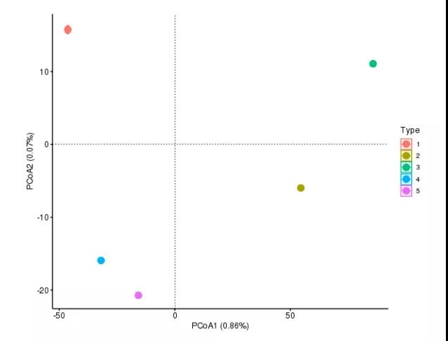分型分析,主要通過統(tǒng)計聚類的方法研究不同樣本菌群物種/功能結(jié)構(gòu)的分型情況。分型分析過程中一般不考慮環(huán)境因子等外部因素的影響。通過分型分析,可以將菌群物種/功能結(jié)構(gòu)相似的不同樣本聚為一類,主要適用于特定環(huán)境樣本的菌群/功能分型,如腸道型(enterotypes)、口腔分型等。通常根據(jù)菌群在所選分類水平上的相對豐度,計算 Jensen-Shannon Distance和PAM (Partitioning Around Medoids)進(jìn)行聚類,通過 Calinski-Harabasz (CH)指數(shù)計算最佳聚類 K 值,然后采用 Between-class analysis (BCA)或principal coordinates analysis (PCoA)進(jìn)行可視化。