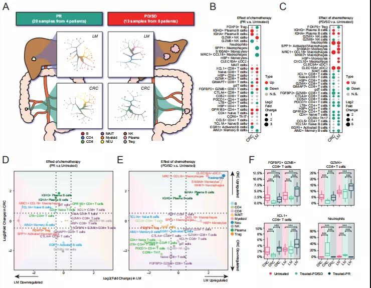 為探索NAC對(duì)腫瘤免疫的影響,本研究使用TooManyCells對(duì)所有CD45+細(xì)胞進(jìn)行聚類分析,發(fā)現(xiàn)CRC和LM之間細(xì)胞聚類的顯著差異(圖 4A)。NAC對(duì)TME的影響高度依賴于細(xì)胞類型(圖 4B和4C)。通常,在PR中,NAC可以下調(diào)免疫抑制細(xì)胞并激活細(xì)胞毒性細(xì)胞(圖 4B)。在LM中,響應(yīng)性NAC下調(diào)SPP1+巨噬細(xì)胞但上調(diào)細(xì)胞毒性T細(xì)胞,例如GZMK+CD8+ T細(xì)胞和XCL1+CD8+ T細(xì)胞(圖 4B和4D)。NAC-PR中僅剩下幾個(gè)MRC1+ CCL18+巨噬細(xì)胞和幾十個(gè)SPP1+巨噬細(xì)胞,表明NAC在抑制巨噬細(xì)胞中的潛在作用。然而,在PD/SD中,觀察到與PR不同的免疫細(xì)胞變化。例如,SPP1+巨噬細(xì)胞和MRC1+ CCL18+巨噬細(xì)胞在LM中增加,而細(xì)胞毒性免疫細(xì)胞(即FGFBP2+ GZMB+ CD8+ T細(xì)胞)下調(diào)(圖 4C、4E和4F)。這些結(jié)果可能與癌細(xì)胞的器官特異性和治療效果有關(guān)。例如,轉(zhuǎn)移性PD/SD癌細(xì)胞表現(xiàn)出DNA修復(fù)和脂肪酸代謝的特異性富集,而轉(zhuǎn)移性PR癌細(xì)胞與脂肪生成更相關(guān)。除腫瘤組織外,NAC上調(diào)鄰近正常肝臟中GZMB+CD8+ T細(xì)胞的比例,并增加PR患者PBMC中FGFBP2+GZMB+CD8+ T細(xì)胞的比例。對(duì)于PD/SD患者,在鄰近結(jié)腸和肝臟中也觀察到FGFBP2+ GZMB+CD8+ T細(xì)胞水平降低??傊行У腘AC不僅重新編程了腫瘤內(nèi)免疫平衡,還激活了全身抗腫瘤免疫反應(yīng),為支持NAC在可切除CRLM中的潛在作用提供了證據(jù)。