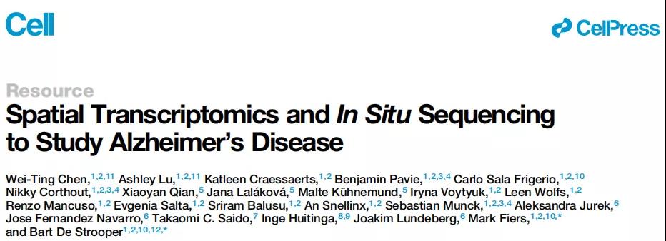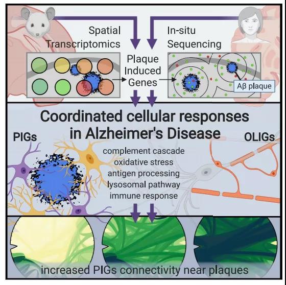 本研究利用空間轉錄組對AD小鼠模型中淀粉樣斑塊組織區(qū)域進行研究,發(fā)現(xiàn)了斑塊誘導的基因(PIGs)注釋到氧化應激和炎癥等相關通路上。此外通過對小鼠和人腦切片進行原位測序(ISS),證實了基因的變化。因此,空間轉錄組測序為探究AD相關腦部組織致病特征提供了可能。