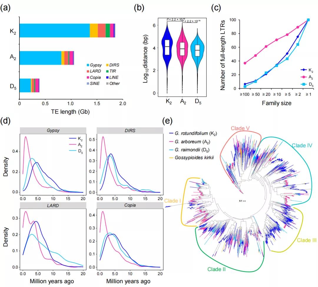 本次研究首次公布了棉屬中二倍體圓葉棉基因組,并對(duì)亞洲棉和雷蒙德氏棉基因組進(jìn)行了升級(jí),解析了轉(zhuǎn)座子活動(dòng)驅(qū)動(dòng)的基因組大小進(jìn)化特征,從轉(zhuǎn)座子擴(kuò)增和染色質(zhì)空間結(jié)構(gòu)角度為棉花物種進(jìn)化提供新的見(jiàn)解,為植物中轉(zhuǎn)座子活動(dòng)介導(dǎo)的轉(zhuǎn)錄調(diào)控進(jìn)化研究提供參考。