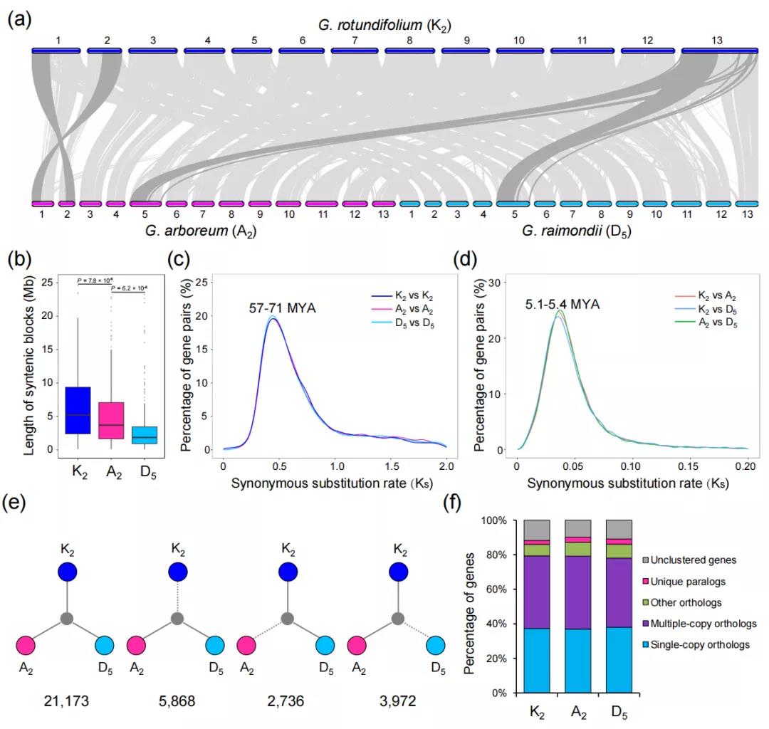 比較基因組分析表明,A2和K2基因組在Chr01與Chr02染色體間存在一個(gè)大的易位;K2和D5基因組在Chr13與Chr05染色體間存在一個(gè)大的易位。Ks分析與前期研究一致,結(jié)果表明,三個(gè)棉種在57-71百萬(wàn)年前存在一次共同的全基因組復(fù)制事件(圖3),并在5.1-5.4 百萬(wàn)年前發(fā)生物種分化,K2、A2和D5基因組與它們最近的外類群約在8.5-10 百萬(wàn)年前發(fā)生了分化。由于這三個(gè)基因組來(lái)自同一祖先,作者探討了物種形成后共線基因丟失和增加的程度。分析表明結(jié)果表明,K2和D5/A2之間的比較顯示 K2缺失基因數(shù)量最多(D5和A2有5868個(gè)共線,而K2中沒(méi)有).使用OrthoMCL進(jìn)行的基因家族分析,發(fā)現(xiàn)三個(gè)棉中每個(gè)基因組大約有15%特異的基因家族。