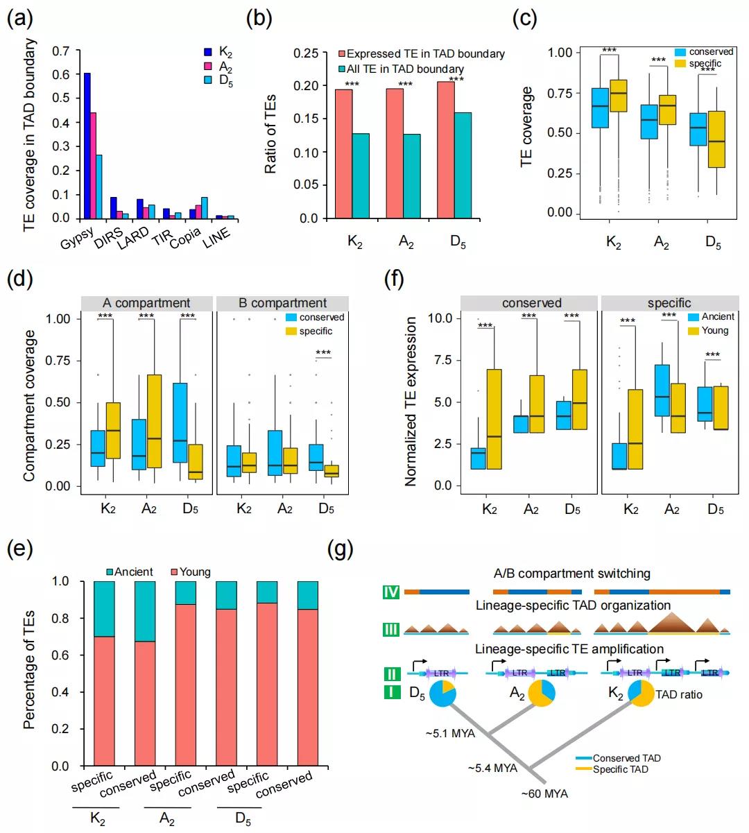 轉(zhuǎn)座因子(Transposable elements,TEs)在真核生物基因組結(jié)構(gòu)的形成中起著重要作用。TE擴(kuò)增和消除影響物種的表型變異、基因轉(zhuǎn)錄、基因組進(jìn)化和群體多樣性。最近的研究表明TEs也可能影響3D基因組結(jié)構(gòu),而在植物中,差異TE積累引起的基因組大小的顯著變化對(duì)染色質(zhì)高級(jí)結(jié)構(gòu)進(jìn)化的調(diào)節(jié)作用仍然未知。
