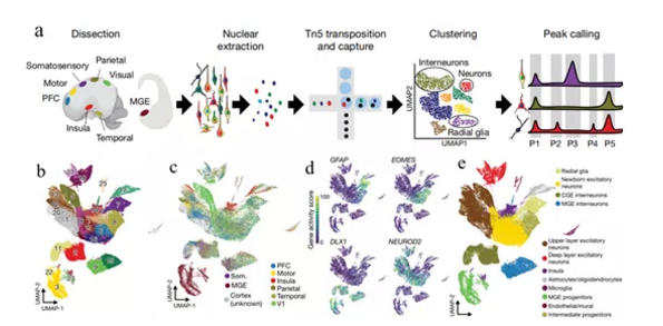 染色質(zhì)狀態(tài)通過(guò)調(diào)節(jié)基因調(diào)控元件(如增強(qiáng)子)的可及性來(lái)確定基因組的功能結(jié)構(gòu),這些元件是轉(zhuǎn)錄調(diào)節(jié)因子的結(jié)合位點(diǎn)。在發(fā)育過(guò)程中,轉(zhuǎn)錄因子的順序級(jí)聯(lián)逐漸重塑,并且不同細(xì)胞類(lèi)型呈現(xiàn)出染色質(zhì)可及性的差異化。盡管染色質(zhì)的可及性是細(xì)胞特性的一個(gè)基本特征,但關(guān)于大腦發(fā)育過(guò)程中染色質(zhì)狀態(tài)變化的研究相對(duì)較少。目前單細(xì)胞基因組學(xué)已經(jīng)能夠使用scATAC-seq以細(xì)胞分辨率對(duì)染色質(zhì)狀態(tài)進(jìn)行可伸縮分析。在發(fā)育中的小鼠大腦中,scATAC-seq揭示了作為神經(jīng)發(fā)育過(guò)程基礎(chǔ)的染色質(zhì)可及性的高度動(dòng)態(tài)變化。有必要將這些研究擴(kuò)展到人類(lèi)初級(jí)組織,以便更好地了解非編碼調(diào)控元件(包括人類(lèi)特有的神經(jīng)發(fā)育增強(qiáng)子)的突變?nèi)绾胃蓴_正常的發(fā)育過(guò)程,并導(dǎo)致精神神經(jīng)發(fā)育障礙的遺傳基礎(chǔ)。
