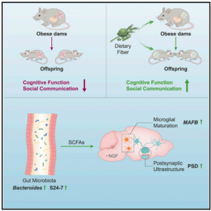 親肥胖與兒童認(rèn)知和社交能力低下密切相關(guān)。此外,已經(jīng)證明,母親肥胖會(huì)破壞后代的行為和腸道微生物群,母鼠或后代的高纖維飲食通過減輕突觸損傷和小膠質(zhì)細(xì)胞成熟缺陷恢復(fù)了這兩種行為和腸道微生物群。共同居住和糞便微生物群移植實(shí)驗(yàn)揭示了微生物群與行為變化之間的因果關(guān)系。此外,用微生物群衍生的短鏈脂肪酸治療也減輕了肥胖母鼠后代的行為缺陷??傊芯勘砻?,微生物群代謝物腦軸可能是母親肥胖引起的認(rèn)知和社會(huì)功能障礙的基礎(chǔ),高膳食纖維攝入可能是一種有希望的干預(yù)措施。