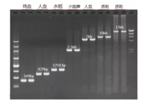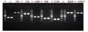 圖2:分別以人、雞、小鼠、昆蟲、質(zhì)粒、玉米、水稻、番茄的全基因組DNA為模板,擴(kuò)增長(zhǎng)度分別為628 bp、2.5 kb、1750 bp、750 bp、549 bp、300 bp、1.5 kb、1.2 kb的目標(biāo)片段。M:250 bp DNA Marker。