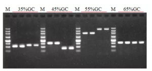 圖3:對(duì)不同GC含量(35%~65%)片段進(jìn)行擴(kuò)增,可實(shí)現(xiàn)高質(zhì)量的擴(kuò)增。M:250 bp DNA Marker。