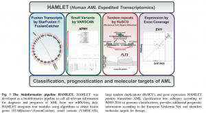 然而,急性髓細胞白血病的z確分類需要不同的技術(shù)來捕獲結(jié)構(gòu)多樣的基因突變,如較大的插入和缺失(indels)、融合基因和除小變異外的結(jié)構(gòu)性染色體變異。此外,結(jié)構(gòu)正?;虻谋磉_水平可對預(yù)后產(chǎn)生決定性影響。因此,在當(dāng)前的技術(shù)平臺下,急性髓細胞白血病診斷及風(fēng)險評估仍然繁瑣、貴,且不完整。為了解決這一需求,我們實施了全轉(zhuǎn)錄組RNA測序(mRNAseq),作為獲取與當(dāng)前和未來分類和風(fēng)險分類相關(guān)的所有遺傳信息的單一平臺。在這種診斷范式中,一個經(jīng)認可的mRNAseq協(xié)議獲取診斷樣本的全面數(shù)據(jù)。對于單次運行數(shù)據(jù)分析,我們開發(fā)了一個指定的集成生物信息管道(人類急性髓細胞白血病快速轉(zhuǎn)錄組學(xué)(HALLET);Fig. 1)。HAMLET具有靈活的適應(yīng)性和個性化,可以查詢一組選定基因的序列變異和表達水平,以及易位情況。