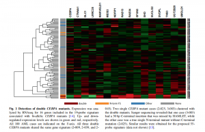 等位基因的CEBPA突變?yōu)楹诵驼5腁ML帶來了良好的預(yù)后并且將一個等位基因上編碼序列的第一個357 bp內(nèi)的N-末端移碼突變與c.834-1074之間的C-末端框內(nèi)插入或缺失相結(jié)合,從而破壞另一個等位基因上的DNA結(jié)合。通過Illumina平臺上通??色@得的reads長度來證明它們在相反染色體上的位置。然而,雙等位基因CEBPA突變與特定的基因表達譜有關(guān)?;趍RNAseq的基因表達譜顯示了特征性的雙等位基因CEBPA攜帶兩個樣本的所有四個急性髓系白血病樣本的突變相關(guān)特征CEBPA突變(2-009、2-039、2-045和3-003),包括其C端突變被HAMLET遺漏的病例3-003(圖3)。11例急性髓系白血病中,有一例CEBPA變異,一個病例(2-025)的特征性N-末端移碼突變與雙聚在一起CEBPA變異。因此,將變異檢測與基因表達譜結(jié)合分析,可以單獨解決變異檢測的不確定性。由于CEBPA 雙突變體的基因標記不是定量的,所以尚未在HAMLET中實施臨床應(yīng)用。