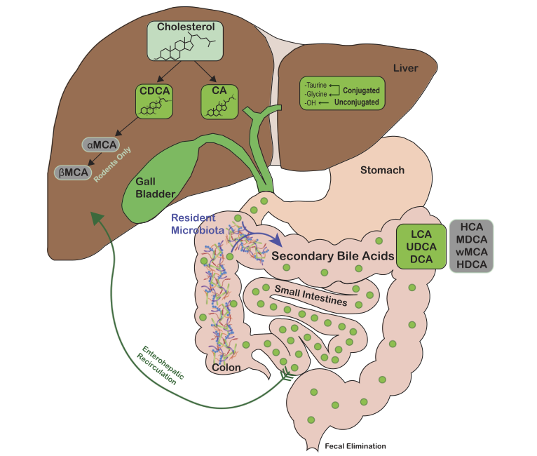 初級膽汁酸進(jìn)入腸粘膜后,會產(chǎn)生50多種不同的次級膽汁酸。膽汁酸的化學(xué)多樣化是宿主(產(chǎn)生初級膽汁酸)和腸道微生物群(產(chǎn)生次級膽汁酸)共同努力的結(jié)果。最近,人們對腸道微生物-膽汁酸-宿主軸的研究正在擴(kuò)展到包括胃腸學(xué)、內(nèi)分泌學(xué)、腫瘤學(xué)和傳染病在內(nèi)的多個領(lǐng)域。[1]