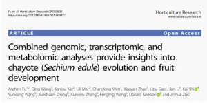 主要內(nèi)容:本研究通過Nanopore技術(shù)首次完成高質(zhì)量的佛手瓜基因組,基因組組裝大小為606.42Mb,ContigN50=8.4 Mb。并基于Hi-C技術(shù)將基因組序列掛載至14條染色體上(掛載率97.04%)。通過與其他13個物種基因家族比較,發(fā)現(xiàn)佛手瓜在25±4百萬年間發(fā)生了一次全基因組復(fù)制事件,是葫蘆科內(nèi)的第三次全基因組復(fù)制事件。通過不同生長時期的轉(zhuǎn)錄組與代謝組分析,進(jìn)一步揭示了在佛手瓜果實(shí)發(fā)育過程中與果實(shí)質(zhì)地、色素、風(fēng)味、類黃酮、抗氧化劑和植物激素有關(guān)的基因。并據(jù)此構(gòu)建了佛手瓜果實(shí)生長發(fā)育調(diào)控模型,并為佛手瓜果實(shí)和塊莖發(fā)育以及遺傳改良的未來研究奠定了基礎(chǔ)。