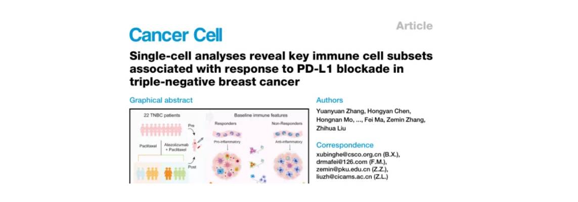 2021年10月14日,中國醫(yī)學(xué)科學(xué)院腫瘤醫(yī)院聯(lián)合北京大學(xué)生物醫(yī)學(xué)前沿創(chuàng)新中心在國際期刊Cancer Cell上在線發(fā)表了題為“Single-cell analyses reveal key immune cell subsets associated with response to PD-L1 blockade in triple negative breast cancer”的研究論文,該團(tuán)隊(duì)結(jié)合單細(xì)胞RNA- seq、TCR-seq和ATAC-seq等技術(shù),研究紫杉醇(paclitaxel,化療)聯(lián)合anti-PD-L1抗體阿替利珠單抗(atezolizumab 免疫治療)治療TNBC(三陰性乳腺癌)患者腫瘤微環(huán)境和外周血中的免疫細(xì)胞動(dòng)力學(xué),揭示應(yīng)答者和無應(yīng)答者的免疫特征,紫杉醇化療聯(lián)合阿替利珠單抗免疫治療在TNBC治療中的機(jī)制和相互作用。