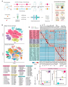 在該課題的研究人員收集了來自22例TNBC患者(11例接受阿替利珠單抗聯(lián)合紫杉醇化療,11例接受紫杉醇單藥化療)治療前和治療后的78例配對(duì)樣本,通過整合單細(xì)胞轉(zhuǎn)錄組測序、T細(xì)胞受體序列測序和染色質(zhì)可及性測序,構(gòu)建了TNBC患者腫瘤微環(huán)境和外周血來源免疫細(xì)胞的高分辨率轉(zhuǎn)錄組和表觀組動(dòng)態(tài)圖譜。該研究在單細(xì)胞水平上對(duì)來自接受兩種治療方案的TNBC病人的腫瘤組織和外周血的免疫細(xì)胞動(dòng)態(tài)分析,系統(tǒng)比較了應(yīng)答患者和非應(yīng)答患者的腫瘤微環(huán)境及外周血免疫特征,闡明了免疫細(xì)胞在不同治療方案下的動(dòng)態(tài)變化,揭示了anti-PD-L1免疫治療聯(lián)合紫杉醇化療在TNBC中的作用機(jī)制。