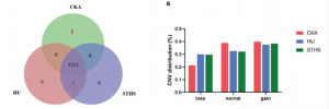 (1)例如,在416個奶山羊中鑒定得到了7,208個CNVs,GWAS分析發(fā)現(xiàn)31個CNVs所在區(qū)域與產(chǎn)奶量等性狀顯著相關,并且發(fā)現(xiàn)在顯著相關的CNVs中,注釋的基因大多數(shù)在產(chǎn)奶相關的生物過程和健康相關性狀中發(fā)揮著重要作用。在另一個研究中,利用新開發(fā)的GWAScore方法整合已發(fā)表的GWAS數(shù)據(jù)來鑒定潛在的候選位點,并對3個不同品種(CKA,n=10、HU,n=10、STHS,n=9)山羊進行全基因組CNVs檢測(圖3),通過將CNVs與GWAScore和QTL位點相整合,發(fā)現(xiàn)197個候選基因與CNVs存在重疊,進一步鑒定得到28個與生長性狀相關的CNVs。